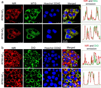 该研究通过在七甲川花菁的一个N-烷基侧链上引入季铵阳离子以增强亲水性;再通过在另一个N-烷基位点连接不同长度的烷基链来调节疏水性,最终合成了四种两亲性七甲川花菁类染料(IR780-NCn,n = 3、6、12、18)。研究表明,随着烷基链长度的增加,染料的clogP值从 IR780-NC3的2.13增加到IR780-NC18的9.02,表明其疏水性逐渐增强。在水溶液中,烷基链较长的花菁更易通过自组装形成球形纳米颗粒。在PBS中,IR780-NC12和IR780-NC18的荧光强度在 800-820 nm 范围内最低,但在非极性环境中荧光显著增强。此外,由于长烷基链对花菁骨架的稳定保护作用,IR780-NC12和IR780-NC18在激光照射下更易产生活性氧(ROS)。在细胞中,IR780-NC12和IR780-NC18的荧光恢复程度也高于其他两种染料,并分别与膜性细胞器(如线粒体和细胞膜)发生明显相互作用。