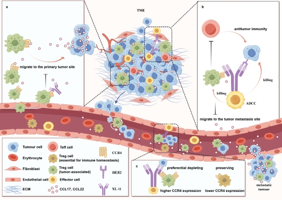 HER2阳性肿瘤(如乳腺癌、胃癌)是临床上恶性程度高、易转移的肿瘤类型。尽管PD-1/PD-L1免疫疗法联合曲妥珠单抗取得了一定疗效,但响应率仍较低。一个重要的原因是肿瘤微环境中大量浸润的Tregs抑制了效应T细胞的抗肿瘤功能。CCR4+ Tregs通过趋化作用浸润HER2+肿瘤微环境,促进肿瘤免疫逃逸。现有CCR4靶向疗法(如莫格利珠单抗)在清除全身性Tregs时易引起显著毒性,且目前仅用于血液肿瘤。此外,肿瘤趋化性外周Tregs作为肿瘤浸润Tregs的关键前体细胞,在以往的治疗策略中常被忽视。