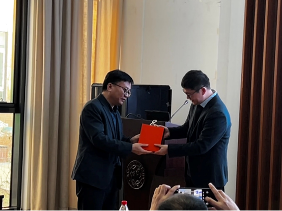 讲座结束后,药学院院长尚鲁庆教授向王朋博士颁发学院纪念品。王朋博士结合自身科研与创业经历,分享了团队在平台迭代、场景验证及工程化推广过程中的实践体会,并鼓励同学们在夯实化学基础的同时,积极培养跨学科能力,以更加开放的视角拥抱化学研发的新范式。